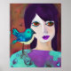 Poster de abstrato com uma garota e seu pássaro na arte de abstrato de chá e roxo.