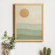Esta trabalho de arte minimalista apresenta uma paisagem serena abstrato com um sol quente e colorido de pêssego posicionado no canto superior esquerdo contra um céu bege suave. Abaixo, as colinas rolantes são representadas em tons de verde-muda em camadas, criando uma sensação de profundidade e tranquilidade. As formas simplificadas e a paleta de cores calmantes evocam uma cena pacífica e natural, perfeita para a decoração moderna ou como um fundo caloroso para projetos criativos.
