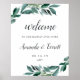 Bem-vindos convidados para o seu casamento com nossa poster de Folhagem Abundante, com uma cor aquática exuberante de verde botânico e folhas de eucalipto, com "bem-vindos a nossa alegria para sempre", seus nomes, e data de casamento em uma mistura chic de serifas e serpentes de caligrafia tradicionais.