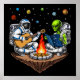 Esta engraçada design de acampamento ao ar livre apresenta uma alienígena e um astronauta sentados em volta de uma fogueira no espaço.