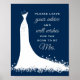 O aviso de chá de panela de casamento e o sinal de desejos de felicidade / poster para a futura noiva na moda apresenta um design de vestido de noiva, um texto personalizado que pode ser personalizado e um sotaque de rolagem. Branco, azul marinho (pode ser personalizado) e cor prateada/cinza.