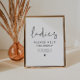 Esta placa de toalete das senhoras do casamento apresenta uma fonte manuscrita e design minimalista simples. A combinação simples de cores preto e branco faz dela a adição perfeita a qualquer evento. Use este poster para sua recepção de casamento, chá de panela, chá de casais, etc.