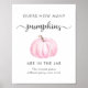 Um bom sinal de jogo para o chá de sua menina com "Adivinha quantas abóboras" escrito como tipografia simples de cinzas e um roteiro de na moda com pestanas e uma aquarela de uma abóbora rosa pastel. Coloque um frasco cheio de abóboras doces embaixo e peça aos seus hóspedes para adivinhar quantos estão no frasco. O vencedor será o convidado que se aproximar mais sem passar. Os cartões de palpite correspondentes estão disponíveis na nossa doce coleção de Chás de Menina de Abóbora.