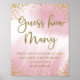 Adivinha quantos sinais de jogo de chá de fraldas com bonito fundo rosa e ouro brilhando. Basta adicionar o texto de sua escolha no estilo de fonte e na cor que você prefere. Esses sinais bonito de jogos cor-de-rosa e chá de fraldas-ouro parecem excelente em uma estrutura decorativa sentada na sua mesa de eventos.