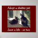 Adotar um abrigo para animais de estimação e salvar duas vidas - uma a ser adotada e outra a ser abrigada nesse local. Posters podem ser personalizados e feitos em quase qualquer tamanho. Inúmeros animais de estimação são mortos em abrigos, com a razão de que há falta de espaço. Isso não precisa acontecer.