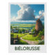 Illustration bucolique d’un village traditionnel de Biélorussie, avec un moulin en bois et des maisons rustiques entourées de prairies verdoyantes. Une ambiance paisible et champêtre. Parfaite comme affiche murale pour les amoureux de la nature.