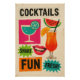 Un joyeux désordre d’éléments découpés compose cette affiche. Des images de verres à cocktails, de fruits tropicaux, de lèvres souriantes et de mots comme « Shake », « Fun », « Fresh! » sont superposés avec des textures papier, du scotch visible et des bords irréguliers. Le fond est une page beige clair légèrement tachée, et les couleurs explosent : fuchsia, vert acide, turquoise, orange et noir. L’ambiance évoque un zine punk ou une couverture de fanzine Dada. Le mot « Cocktails » est tamponné en haut, comme s’il avait été fait à la main.