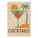 L’affiche met en scène un grand verre à cocktail stylisé au centre, dessiné en aplats de couleur avec des formes géométriques simples. Le verre est incliné légèrement, laissant s’échapper une olive suspendue dans l’air. En arrière-plan, un soleil ocre orangé évoque les couchers de soleil des années 60, tandis qu’un palmier schématique se découpe dans un coin, évoquant une ambiance de vacances et de dolce vita. La palette se compose de rouge corail, vert menthe, jaune moutarde et beige vieilli. La typographie en bas, fine et élégante, indique simplement « Cocktails » en capitales, dans une fonte inspirée du mid-century modern.