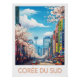Affiche illustrée de la Corée du Sud représentant une rue animée de Séoul bordée de cerisiers en fleurs, de néons colorés et de gratte-ciel. Une décoration murale vibrante qui capture l'énergie printanière et urbaine de la capitale coréenne.
