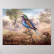 De uma pintura de óleo original de Brenda Thour de um pássaro colorido chamado Africano Lilac Brested Roller sentado em um galho com elefantes em fundo empoeirado. Foto de referência do Dr. Thomas Trainer. Copyright de Brenda Thour 2006.