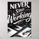 Este impressionante design em preto e branco no estilo de revista captura a essência da dedicação e perseverança através de sua tipografia em negrito e composição visual limpa. A frase “Nunca Pare de Trabalhar” está no centro em um estilo artístico e decorativo, simbolizando esforço contínuo e uma mentalidade inquebrantável.