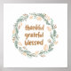 Uma poster bonita que você pode pendurar como uma decoração caseira. Apresenta uma coroa de outono de folhas amarelas, marrons e verdes e tem uma redação que diz "graças grato e abençoado".