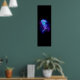 Água-viva grande, azul, desenhada artisticamente, brilhante, brilhante, com longos tentáculos sobre fundo preto com bioluminescência roxa. Água-viva luminosa.