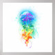 Água-viva grande, iridescente, desenhada artisticamente, brilhante, com longos tentáculos em branco, pintada sobre fundo de aquarela multicolorido. Água-viva arco-íris.