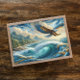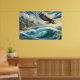 Uma pintura de uma águia majestosa soprando acima de uma onda intermitente, representada com detalhes intrincados no petróleo contra um fundo de ouro e mármore. simbolizando força, patriotismo e liberdade.