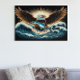 Uma águia poderosa graciosamente esbarra sobre um peixe empoleirado sobre uma onda criadora em uma exibição mesmerante de naturezas beleza e equilíbrio.