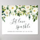 Projetado para combinar com a nossa coleção de casamento Alabastro Floral, este elegante cartaz botânico convida convidados para o casamento para celebrar o feliz casal com um faísca. Personalize com duas linhas de texto personalizado no script de caligrafia e na letra serif tradicional (mostrada com "Let Love Sparkle: sparkler sendoff at [time]"), com uma borda superior de flores brancas de aquarela e folhagem verde esmagadora.