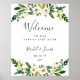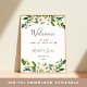 Bem-vindos convidados para o seu casamento com o nosso Alabastro Floral poster, apresentando uma cor aquática brilhante verde botânico e flores brancas, com "bem-vindos à nossa alegria para sempre", os vossos nomes e a data do casamento numa mistura de blocos modernos e letras caligráficas manuais.