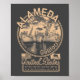 Alameda City, Califórnia no estilo antigo de design com bandeira estadual, lema e coordenadas da Califórnia no Condado de Alameda. A cidade foi incorporada em 7 de março de 1872. O quadro é um cruzador militar de marinho antigo no porto de Alameda.