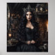 Alegra, a Rainha das Bruxas, se deslumbrante exibir sua coroa. Tão adorável com cabelo preto e ondulado a escorrer pelas costas. Ela tem um rosto sem falhas com belos olhos postos com lábios pretos e escuros. Ela está vestindo um elaborado vestido preto. Ela está rodeada pelas utensílios de seu ofício, velas, livros de feitiços, potes de ingredientes contendo coisas que você preferencialmente não sabe o que é. Criado com a ajuda da IA.