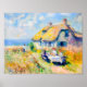 Uma pintura impressionista pacífica de uma cabana de telhado chocado perto do mar. As cores quentes, o verde-luxuoso e o oceano sereno criam uma cena costeira acolhedora e nostálgica.