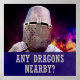 Vista aproximada de um capacete e de uma armadura de pratos de um cavaleiro medieval contra o fundo colorido que imita o espaço exterior ou um campo de batalha ao seu gosto. Texto - Algum dragão por perto? - adicionado