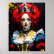 Imaginando Alice como a fantasia da Rainha Vermelha IA gerou arte nas cores vermelha, azul, amarela, preta e branca com cinzas de tinta.