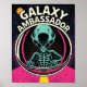 Uma ilustração vibrante de pop-arte apresenta uma alienígena de pele verde com olhos grandes e costelas proeminentes, saindo de uma janela de espaçonave circular. As mãos das alienígenas estão apertadas e a sua expressão é séria. O fundo é um espaço escuro com estrelas e um planeta laranja brilhante. O texto "GALAXY AMBASSADOR" é escrito em caracteres a negrito e branco em volta da cabeça de alienígena, criando um quadro circular. Pode ser dado como presente aos amigos e à família.