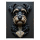 Um azulejo cerâmico muito detalhado que mostra um retrato de cabeça e ombros de um cão terrier mix. O cão olha diretamente para fora com olhares robustos e brilhantes de cor castanho-quente e vidrado, transmitindo emoções semelhantes à vida. Sua pelagem esculpida é esculpida meticulosamente em fios e grumos, então terminada com esmaltes: preto brilhante profundo para o casaco, branco-prateado mate para sobrancelhas e realces expressivos, e bege suave de cetim para a foca, barba e mancha torácica. O nariz é rendido num olhar brilhante e molhado para o realismo. Dirigido sobre um fundo cerâmico escuro, de vidros mattos, o retrato se destaca com nitidez impressionante. A iluminação ainda enfatiza as texturas dimensionais e o artesanato especializado em vidros, criando uma representação vívida e semelhante à vida em forma cerâmica.