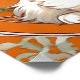 Poster com um gatinho branco no estilo Art Nouveau de Alphonse Mucha! Um belo gatinho com olhos azuis piercing olha para o espectador. Círculos geométricos laranja com folhas verdes e lattice branca rodeiam o gatinho. Um presente perfeito para amantes de gatos e colecionadores de Art Nouveau!