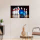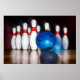 Atingir os pinos "alta descarga" quase sempre resulta em greve. Dez pinos prestes a serem esmagados pela bola de boliche azul girando entrando no bolso um de três. Boliche gráfico com bola e pinos reais. Perfeito para a caverna de homem ou escritório.