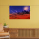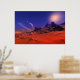 Uma cena espacial do início da tarde num planeta vermelho distante. A superfície das montanhas é coberta por neve com uma fina camada de óxido de ferro vermelho, ou simplesmente ferrugem poeirenta. A superfície laranja-vermelha e o céu azul criam uma iluminação ambiente quase ilusória. Perto do horizonte, um planeta gigante e sua lua estão vagarosamente emergindo.