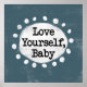 O texto em negrito lendo "Ame-se, Bebê" está centrado em um fundo de cinza. O texto preto se senta em um círculo branco com grandes pontos brancos texturizados ao seu redor, fornecendo um contraste divertido contra o pano de fundo colorido.