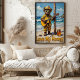 Esta charmosa trabalho de arte apresenta um urso vestido de bombeiro, cheio de capacete e óculos de sol, tocando um violão acústico enquanto se inclinava contra um posto de madeira numa praia arenosa. Um pote de mel fica perto. O fundo mostra um oceano vibrante com ondas suaves e um céu azul com nuvens fluffy. A pintura usa pinceladas grossas, texturizadas, dando uma sensação caprichosa e entusiasmante, com "Love My Honey" escrito abaixo.