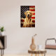 Um retrato aproximado de um Labrador Retriever amarelo, seu pelo rendeu em um estilo pareado, com uma bandeira americana ligeiramente desfocada como pano de fundo. Os olhos do cão estão focados no espectador, transmitindo um sentido de lealdade e patriotismo. As cores vermelha, branca e azul da bandeira são muda, criando uma atmosfera quente e nostálgica.