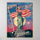 A estátua da liberdade apareceu de forma proeminente no centro. Uma bandeira americana vibrante acenando ao fundo com fogos de artifício a rebentar à sua volta. "Feliz 4 de julho!" em uma fonte ousada, estilo vintage no topo, com "Liberdade Celebrada" em um roteiro menor e elegante abaixo. Vermelho, branco e azul tradicionais, com uma sensação de vintage ligeiramente esmaecida.