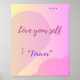 Esta arte mural enfatiza a mensagem eloquente "Ame-se a Si Mesmo", escrita em ousada tipografia na moda para inspirar autoempoderamento e autocuidado. Colocada sobre um plano de fundo pastel calmante, a trabalho de arte expele calor e positividade. Acentos deliciosos como corações, motins florais leves ou faíscas sutis cercam o texto, criando um design harmonioso e convidando. Perfeito para qualquer espaço, esta peça serve como um lembrete gentil para priorizar o amor próprio e estimar a sua individualidade.