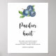 Cartão de convite para chá de fraldas em forma de grão com ilustração aquosa de mirtilos. O texto diz "um bebê doce de fruta está a caminho." Itens correspondentes disponíveis.