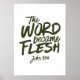 Bold Christian typography: “The Word became Flesh” — John 1:14. Handwritten dark green scripture for faith apparel or decor. Minimalist Bible verse design centered on Jesus.