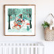 Uma bela ilustração com animais da floresta num manto com uma menina e dois pinguins. Numa neve cobriu a floresta de inverno com cogumelos e árvores. Arte original de Caroline Bonne Müller