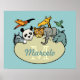 Uma bela ilustração com um zoo-tema com um monograma. Muitos animais bonitinhos rodeiam um nome. Ideia de decoração do tema da selva para o quarto de criança. Com a ferramenta 'personalizar', você pode fazer as alterações necessárias no design, como alterar a cor azul do fundo e os estilos e tamanhos da fonte