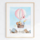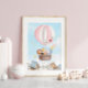 Adicione um toque de calor e suavidade ao seu pequeno berçário, quarto ou sala de jogos com este adorável impressão de bebê safari voador. Design apresenta um balão de ar quente cor-de-rosa com flores, leão, girafa, elefante, zebra, macaco, nuvens e estrelas. Esta arte aquarela trará vida a qualquer quarto!