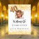 Uma poster de boas-vindas para um aniversário de 40 anos feminino e glamouroso. Um fundo branco decorado com um confete colden. Personalize e adicione uma foto e um nome. O número 40 é escrito com uma fonte de estilo de balão.