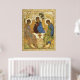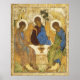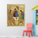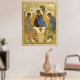 pintura cristã medieval de andre rublev sobre sua interpretação da trindade com três anjos com asas ouros, halo, verde, vermelho e manchas de ouro, sentados ao redor de uma mesa. arte ilustrativa fina em dourados e verdes, em uma delicada e refinada pintura religiosa.