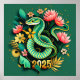 Um design vibrante e criativo para o novo ano de 2025, com um cobra verde de madeira enrolada graciosamente no centro. A cobra tem um brilho brilhante, quase metálico, e seus olhos são um ouro mesmerizante. Ao redor do cobra, há flores e folhagem delicadas em tons de verde e ouro, simbolizando o crescimento e a prosperidade. O texto "Feliz ano novo" é escrito em caracteres elegantes e cursivos, sendo o ano "2025" apresentado de forma destacada abaixo.