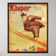 Ilustração Vintage sueca de 1929 com anúncio para Charutos Kasper. Um cavalheiro em trajes formais, com chapéu de alto, monóculo, palha e bengala tocados em esquis, fumando charuto na boca, veste uma bandeira de Suecia em sua lapela. Bandeiras da Noruega, Dinamarca e Finlândia acenam abaixo dele. Nostalgia escandinava e lembranças do cigarro dos presentes escandinavos.