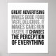 A publicidade a excelentes faz um bom gosto comida delicioso. Faz os carros correrem mais rápido. Muda a percepção de tudo