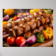 Apelidante Shish Kebab com Carne grelhada e vegetais servidos em Conselho de madeira - Comida saborosa. Descongelar o sabor das tortas de carne grelhada e dos kebabs brilhantes com uma variedade de legumes coloridos.