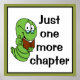 Poster de diversão para amantes de livros. Dentro a quadrado branco com um quadro preto e verde é um belo worm que veste óculos e segura um livro marrom. Ele está mostrando o polegar para cima e tem um grande sorriso feliz. À direita do verme estão as palavras "apenas mais um capítulo" em letras negras.