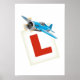 Aprendendo a pilotar um belo avião azul de desenho animado com uma placa L para alunos.